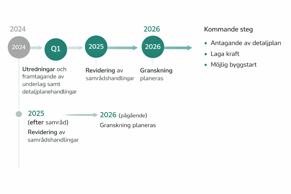Arbetet har gått vidare sedan samrådet och befinner sig nu i slutskedet av revideringen av samrådshandlingarna. Målsättningen är att plan- och byggnadsnämnden ska kunna fatta beslut om granskning i juni 2026.